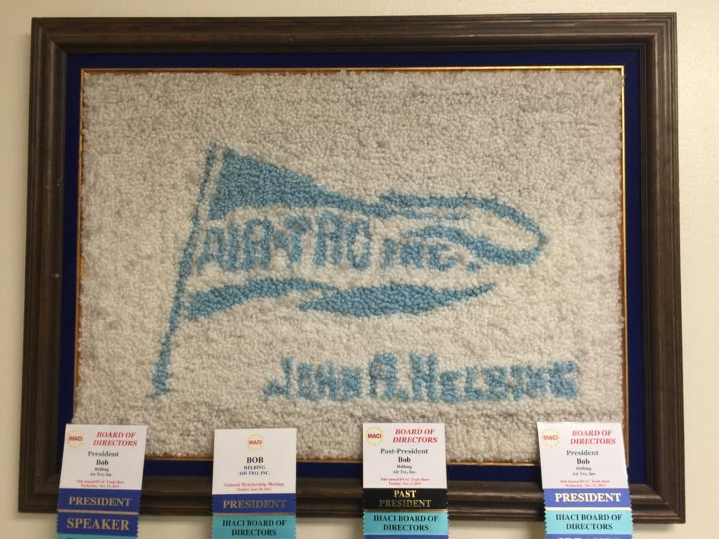 But what you might not know about is the carpet art I have hanging in my office. Carefully crafted from carpet yarns in the same colors as our logo, it’s been above my desk for decades now. I’m not sure who made it, or what the occasion was, but it’s been carefully framed and preserved, and makes a nice counterpoint to the stained glass Air-Tro logo I also have across from my desk, near the ancient blue leather chairs my dad purchased close to when he started the company, all the way back in 1969.