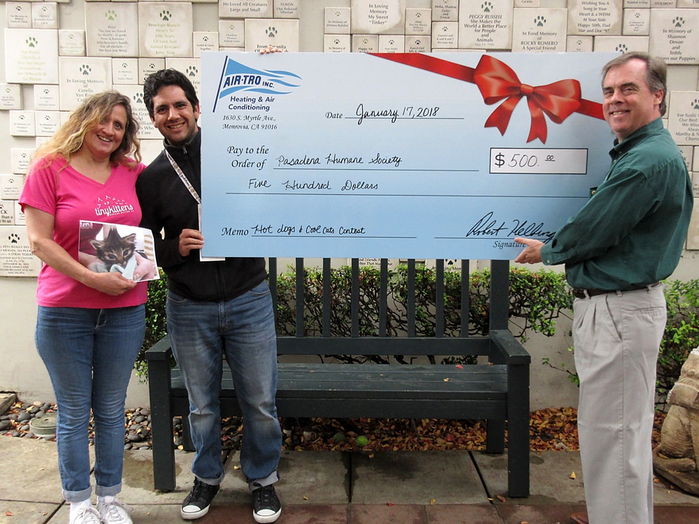 The results are in! Local resident Alison Flores and her cool cat Raider won the 2017 Air-Tro Hot Dogs & Cool Cats Pet Photo Contest. Alison is a committed pet owner and cares deeply about animal welfare. In fact, she is pictured above holding a photograph of “Nano,” a beloved cat saved by Tiny Kittens, a feline rescue in which Alison is very active. Unfortunately, “Nano” was too tiny to survive. Alison requested her $500 donation from Air-Tro be made in his memory to the Pasadena Humane Society.