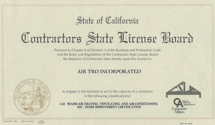 California’s contractor licensing rules divide HVAC work into multiple classes, making it vital that your contractors cover all the bases. In addition to our C20 (HVAC) license, Air-Tro also holds licenses in C10 (Electrical Contracting), C36 (Plumbing) and C38 (Refrigeration). That means we can handle all the utilities that HVAC equipment must connect to for proper operation. If a project requires even more outside trades (framing, roofing, etc.) we also hold a B (General Contracting ) license. This gives us the legal certification to manage any other trades on your project. Air-Tro employs a full-time Professional Engineer (PE-Mechanical) for plan submittals if needed.